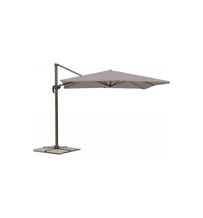 Con palo di sostegno in alluminio con sezione da Mm. 77x53, struttura composta da 8 stecche in acciaio. Struttura e stecche verniciate a polvere. Ruotabile a 360°. Manovella di apertura. Completo di antivento. Telo di copertura in poliestere con spalmatura anti acqua, da Gr./ Mq. 240. Base a croce porta mattonelle.