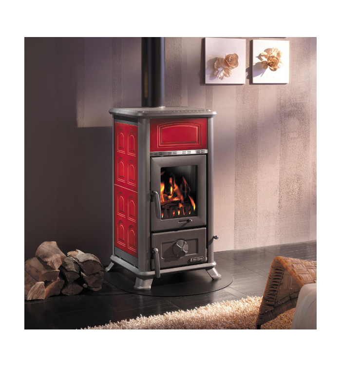 Rivestimento esterno in maiolica e ghisa. Porta e testata in ghisa smaltata. Vetro ceramico con fuoco a vista. Aria primaria e secondaria. Doppia combustione. Registro aria secondaria. Volume riscaldabile: Mc. 186. Peso: Kg. 92. Dimensioni: larghezza Mm. 465, profondità Mm. 495, altezza Mm. 845. Diametro scarico fumi Mm. 120. Kw. 8,9